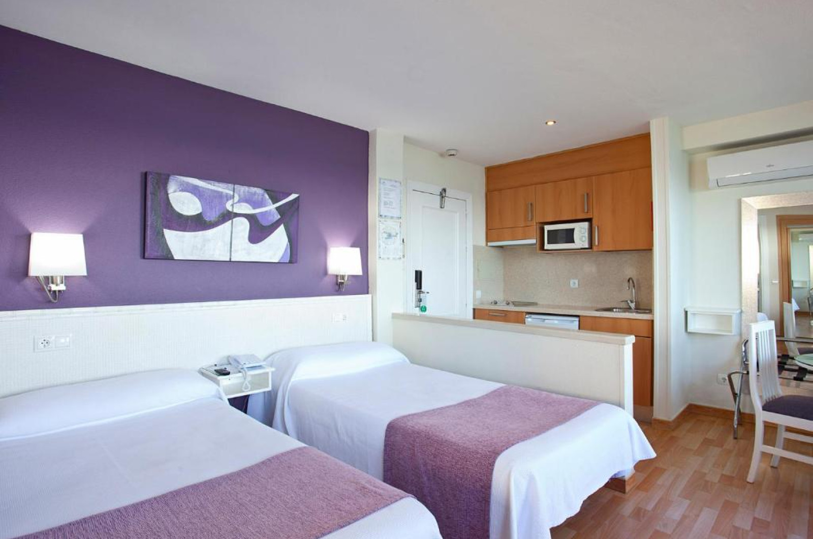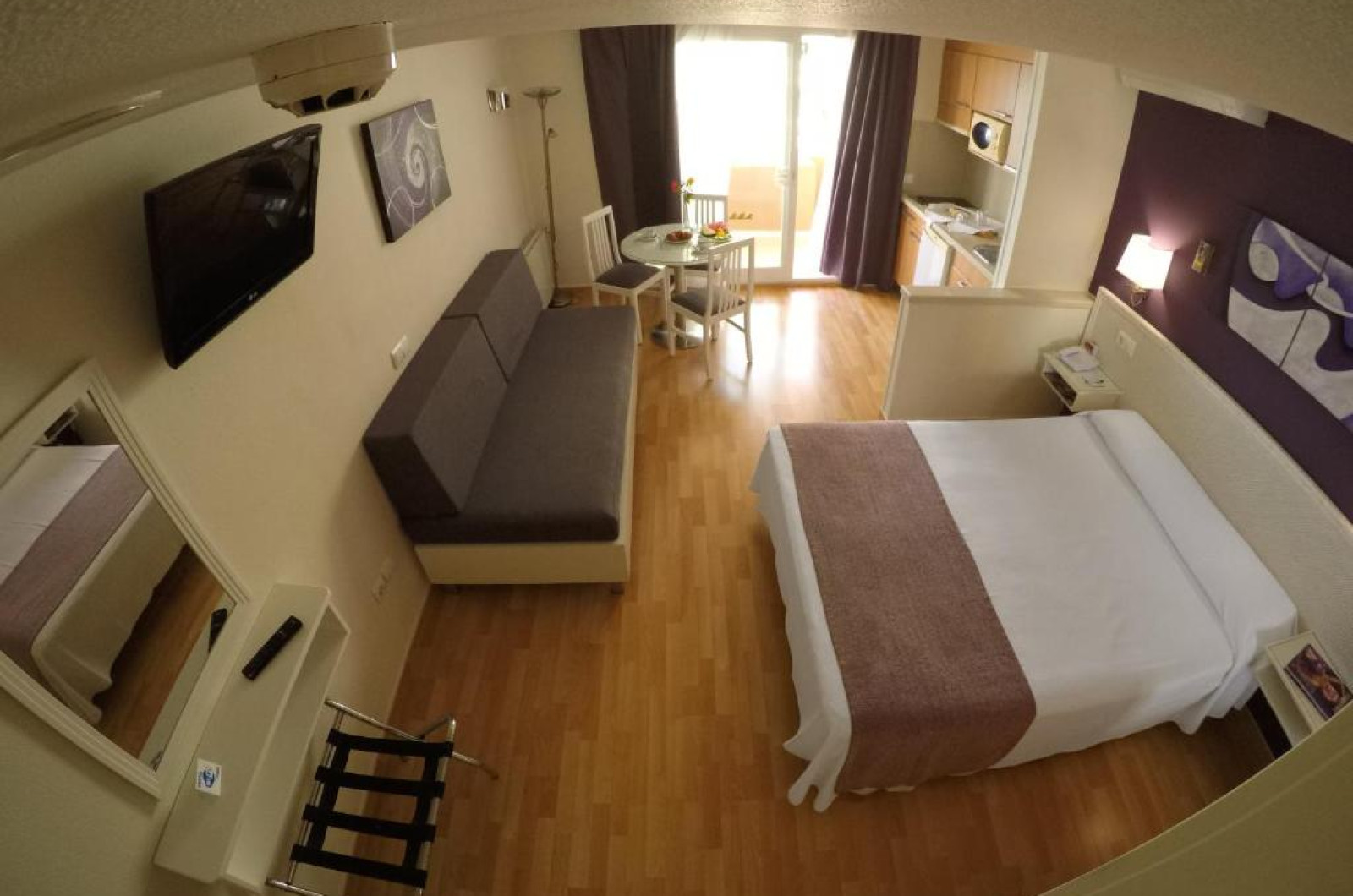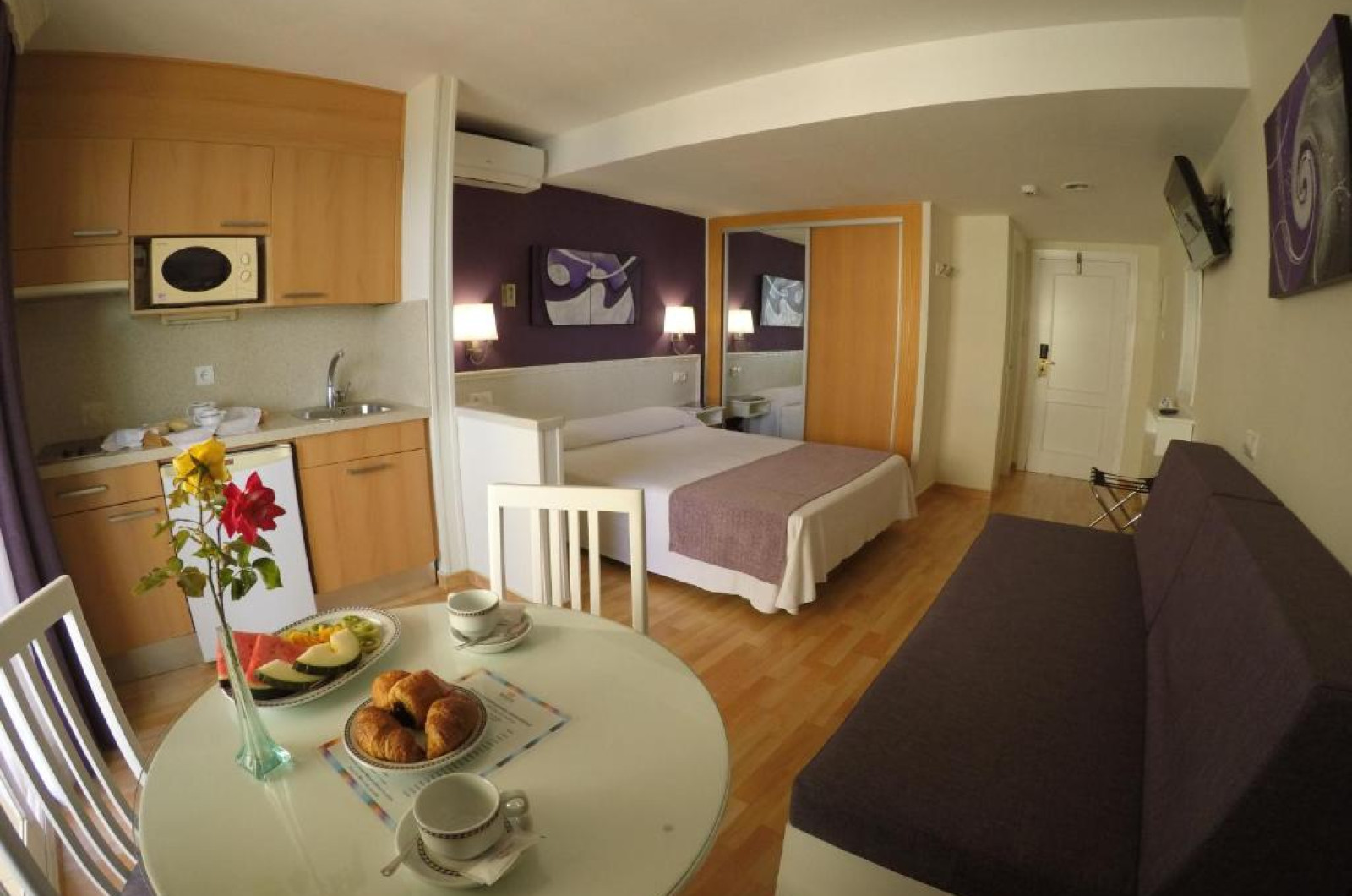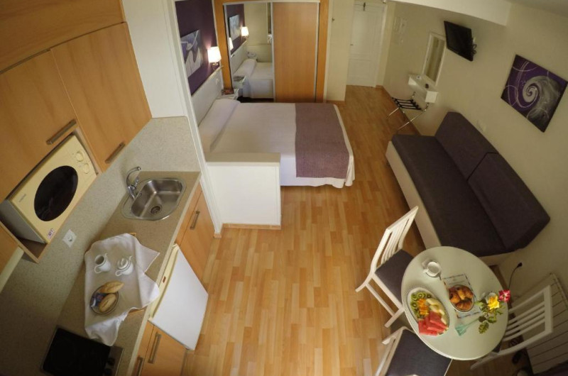 Facilitati studio: pat matrimonial sau twin, baie proprie, seif (contra cost), aer conditionat, telefon, uscator de par, TV prin satelit, chicineta, terasa.