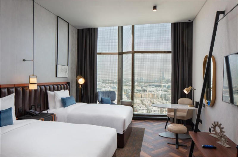 Camerele luminoase de la Doubletree By Hilton Dubai M Square Hotel & Residences sunt dotate cu parchet, aer condiționat, Tv cu canale prin satelit. Un minibar și o mașină pentru preparare cafea sau ceai se află în fiecare cameră. Oaspeții pot solicita serviciul de room service pentru a servi masa sau diverse băuturi. În camere există baie cu cadă sau duș, foehn, articole de toaletă gratuite, precum și halate de baie și papuci. Oaspeții au acces gratuit la serviciul Wi-fi în camere. Curățenia in cameră se face zilnic. Proprietatea oferă camere pentru familie cu o suprafață mai mare și un număr mai mare de paturi față de cele standard.
