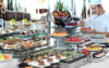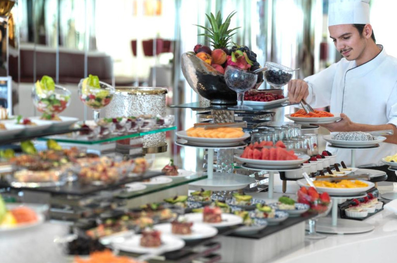 La Raffles The Palm, oaspeții pot savura o varietate de bufete cu preparate japoneze, mediteraneene și internaționale. Restaurantul Le Jardin servește in fiecare zi un bufet delicios de mic dejun.