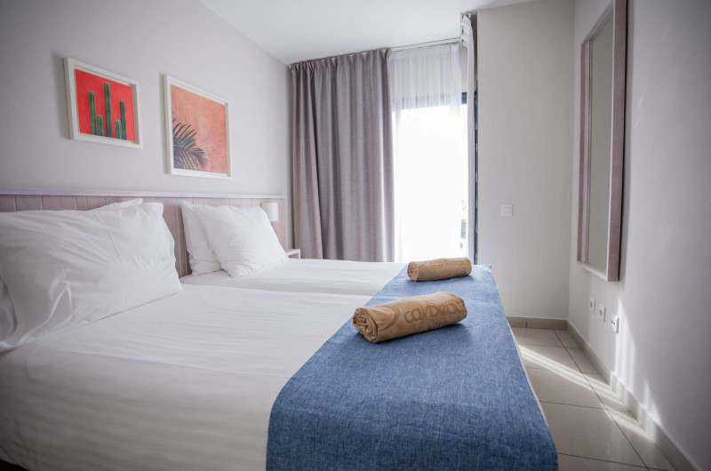 Camerele au un aparat de aer condiționat, sufragerie, bucătărie și baie. În majoritatea camerelor se găsește câte un balcon. Clienții pot dormi confortabil pe o canapea. O altă opțiune disponibilă sunt dormitoarele separate. În plus, pentru cei mici sunt disponibile paturi pentru copii. De asemenea, sunt disponibile un seif și un minibar. Există o chicinetă echipată cuprinzător cu un frigider, un aragaz, un cuptor cu microunde și un aparat pentru cafea/ceai. În plus, există un telefon cu apelare directă, un televizor și WiFi (gratuit). În baia dotată cu un duș și o cadă dispune de un uscător de păr. Unele dintre camere amenajate pentru scaun cu rotile dispun de baie fără bariere. Aparthotelul oferă camere de familie și 100 de camere de nefumători.