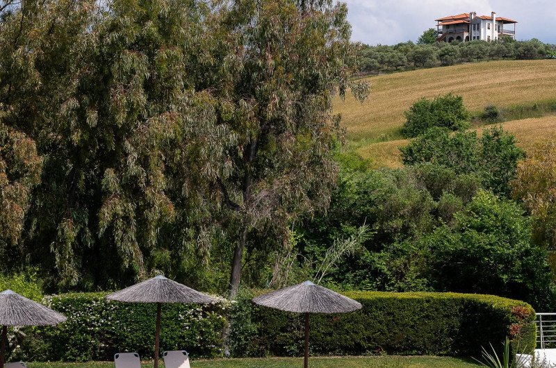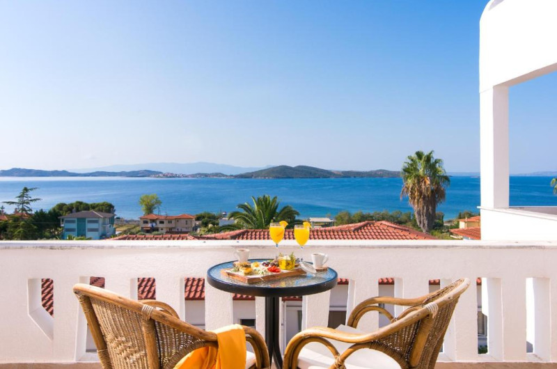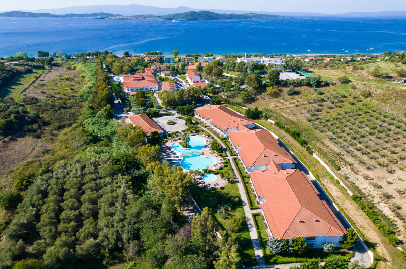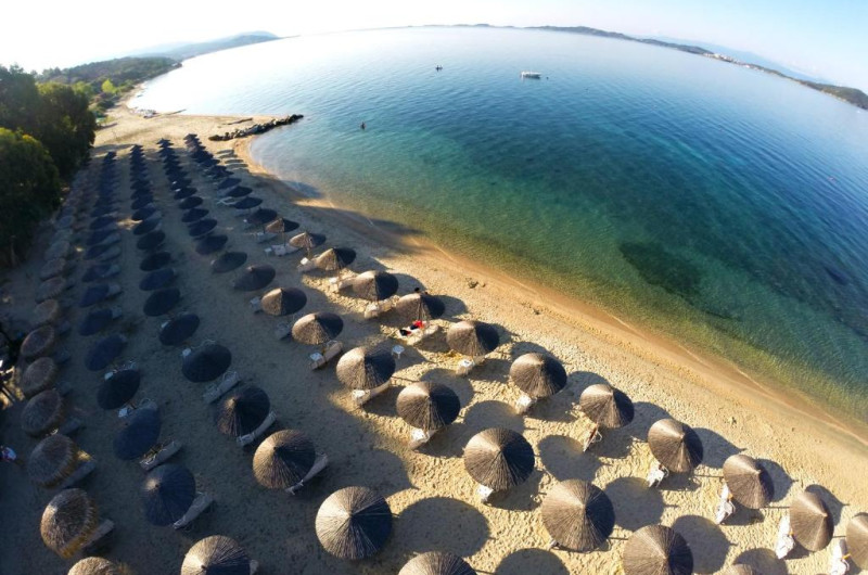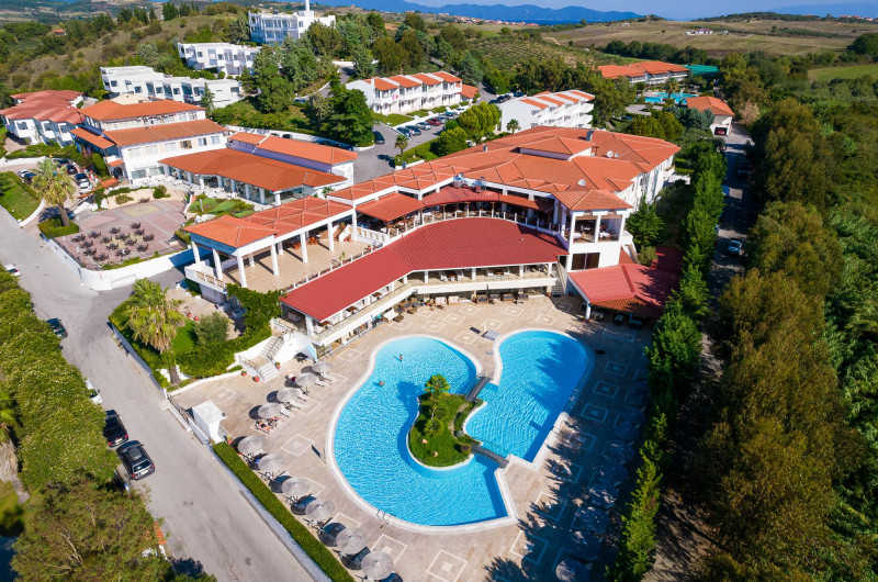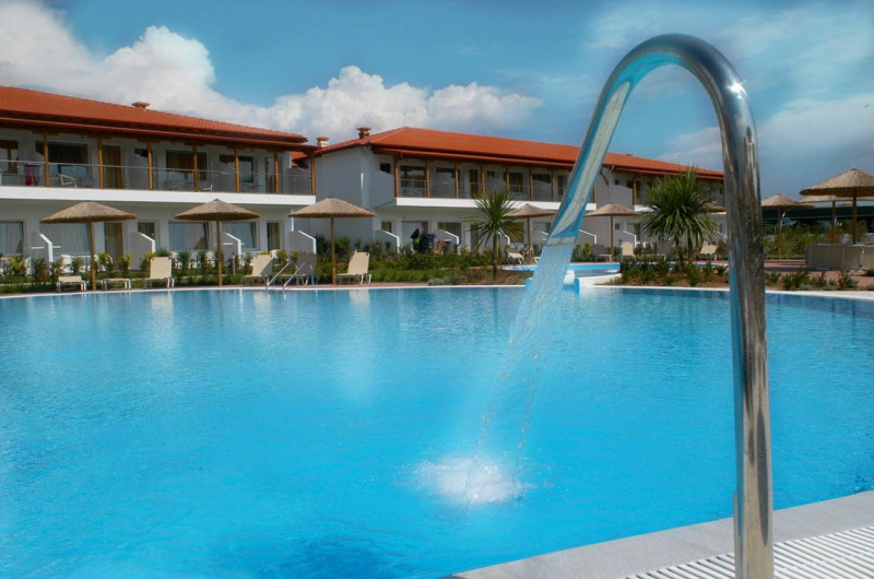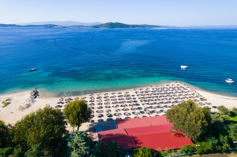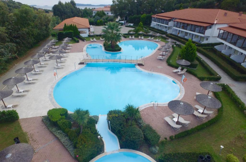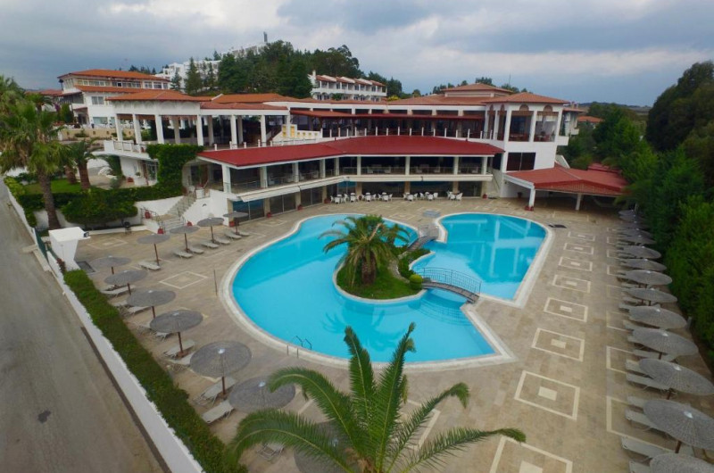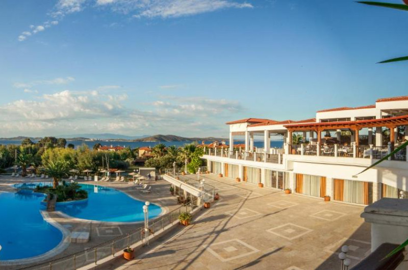 Hotelul spa pentru turiști de la plajă, turiști activi și turiști care fac sport, vacanțieri de la club, familii, celibatari și cei îndrăgostiți de natură, se află la câteva secunde de plaja cu nisip a hotelului, chiar în afara Uranopolisului, până în centrul localității sunt cam 7 km. Stațiile mijloacelor locale de transport în comun se află chiar în fața ușii.