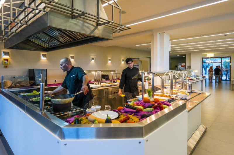 La Lagomandra Hotel & Spa oaspeții au la dispoziție un restaurant care servește mâncare în stil bufet și à la carte. Preparate din bucătăria grecească și internațională așteaptă să fie degustate în fiecare zi la micul dejun, prânz și cină. Masa poate fi servită atât în interior, cît si în aer liber, pe terasă, în funcție de vreme. Oaspeţii pot avea diverse băuturi răcoritoare sau alcoolice la bar.