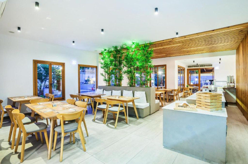 La Palladium Hotel oaspeții au la dispoziție un restaurant care servește mâncare în stil bufet. Preparate din bucătăria grecească așteaptă să fie degustate în fiecare zi. Masa poate fi servită atât în interior, cît si în aer liber, pe terasă, în funcție de vreme. Oaspeţii pot avea diverse băuturi răcoritoare sau alcoolice la bar. În cadrul proprietății există și un snack bar care servește băuturi și gustări. Pentru cei cu anumite nevoi de nutriție, Palladium Hotel oferă meniuri pentru diete speciale.