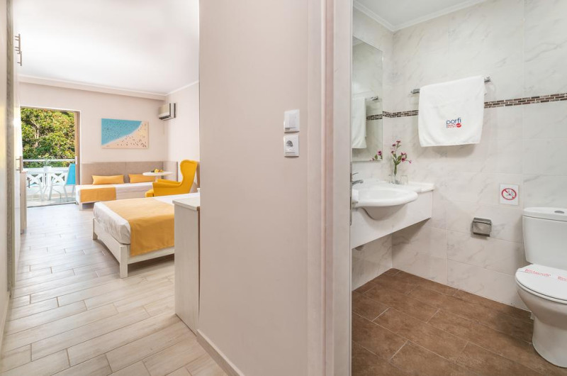 Sunt disponibile 87 camere. În camere există baie cu duș. Oaspeții au la dispoziție serviciul de room service pentru a servi masa sau diverse băuturi. Camerele luminoase de la Porfi Beach Hotel sunt dotate cu aer condiționat, Tv și seif. Oaspeții au acces gratuit la serviciul Wi-fi în camere. Curățenia in cameră se face zilnic. Proprietatea oferă camere pentru familie cu o suprafață mai mare și un număr mai mare de paturi față de cele standard. Se pot rezerva de asemenea camere pentru nefumători.