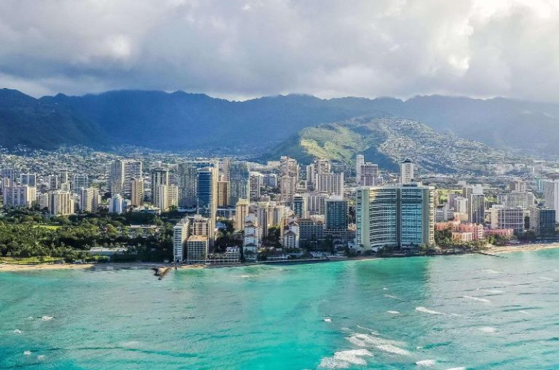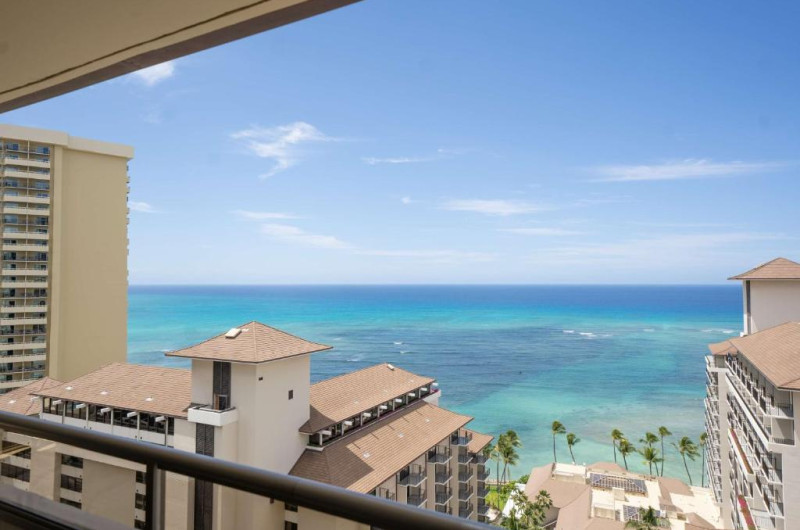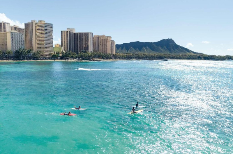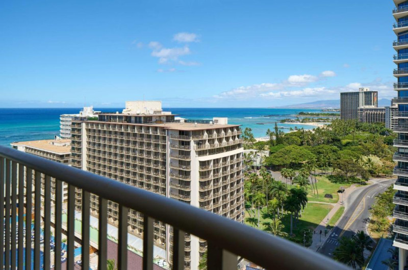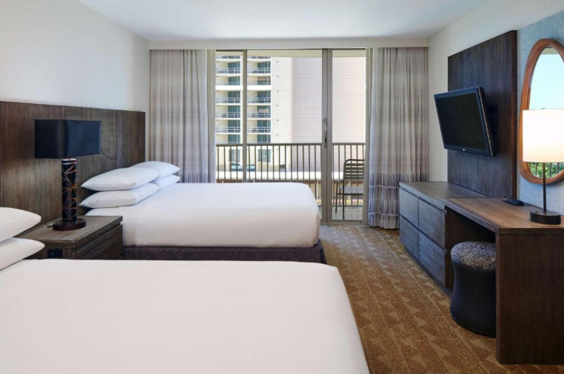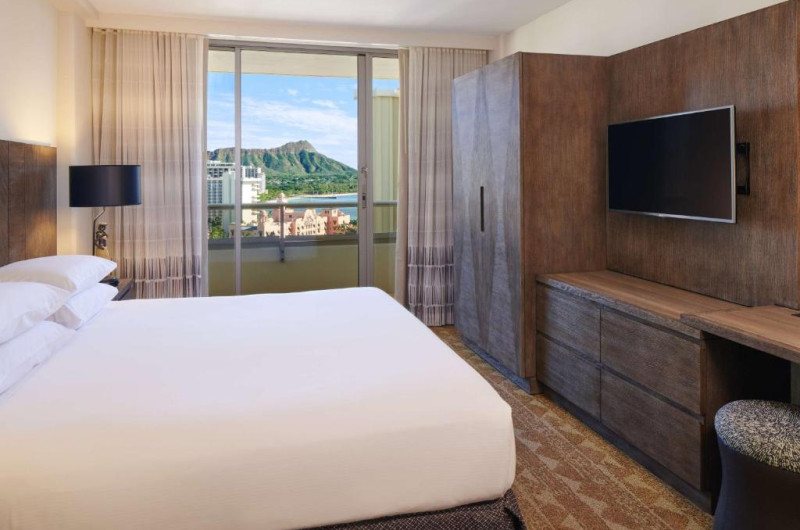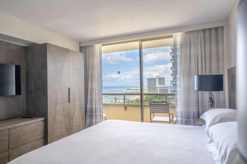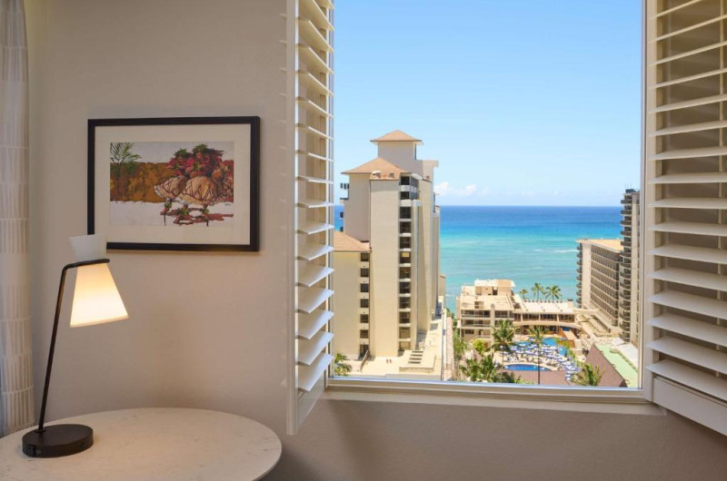 Amplasat la doar cațiva pași de plaja Waikiki, Embassy Suites by Hilton Waikiki Beach Walk este un complex de suite situat chiar langă strada principală a bulevardei Kalakaua. Oferă WiFi gratuit și facilități confortabile și este inconjurat de un peisaj luxuriant și prezintă artă tradițională hawaiană.
