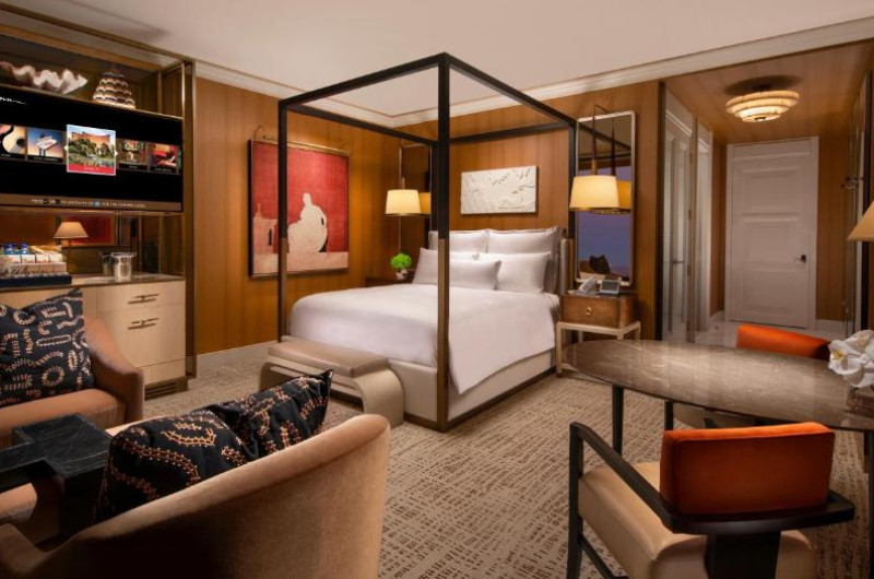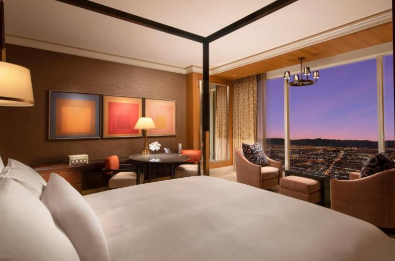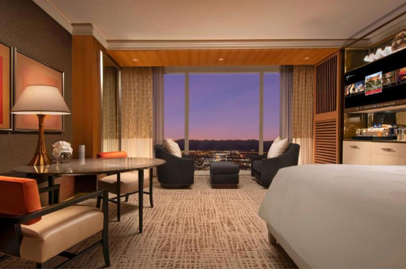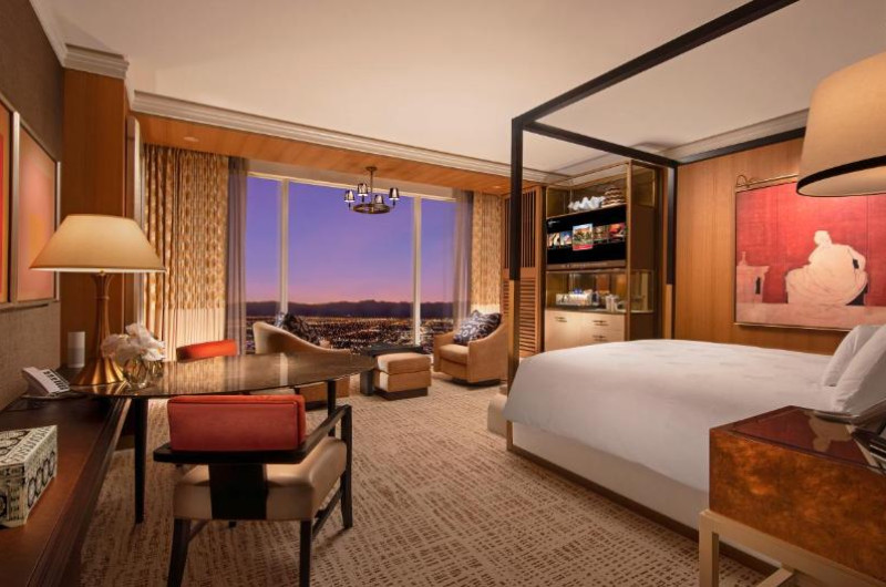 Camerele de lux de la Wynn Las Vegas au ferestre spațioase cu vedere la Las Vegas. In fiecare cameră sunt disponibile paturi Wynn Dream, televizoare cu ecran plat și WiFi.