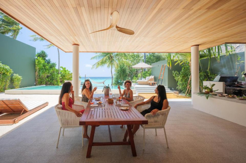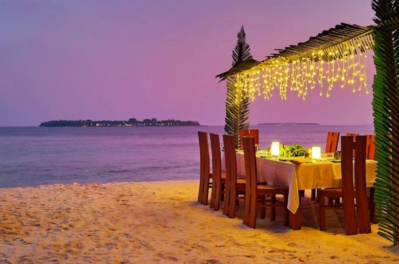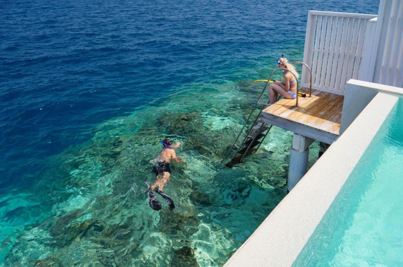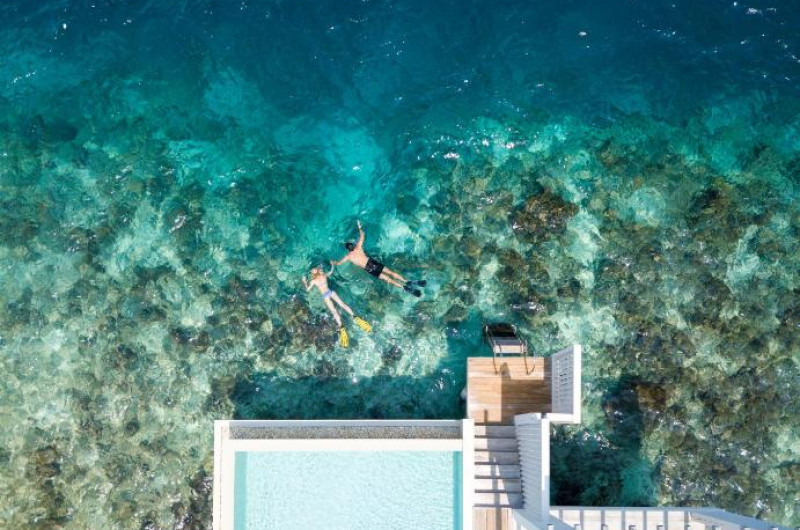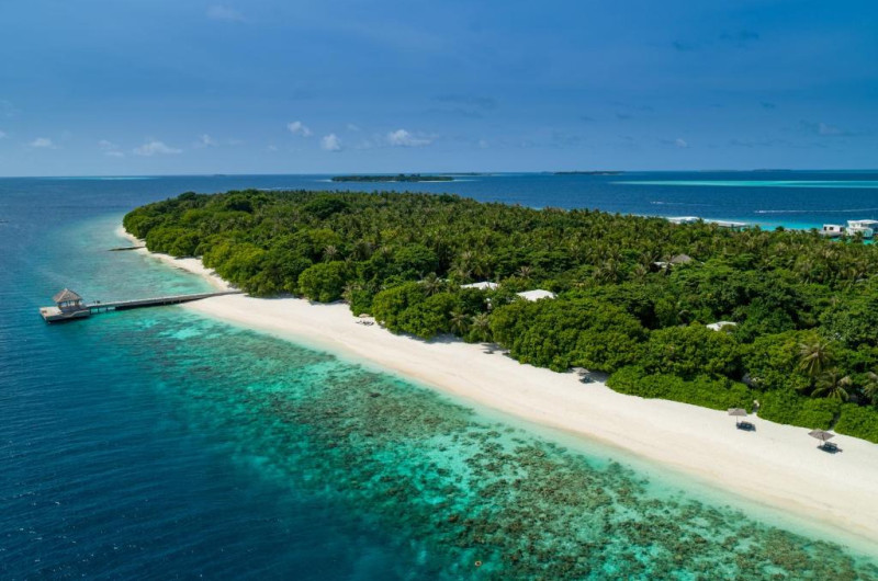 Plaja privată cu nisip fin se intinde de-a lungul intregii insule, oferind acces direct la laguna cristalină ideală pentru inot și snorkeling.