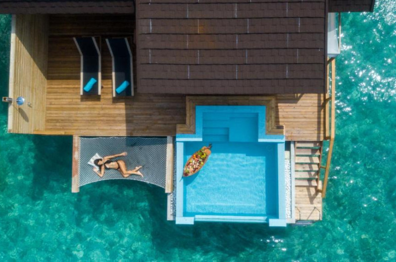 with dining areas and breath-taking views of the surrounding crystal clear lagoon, with their own plunge