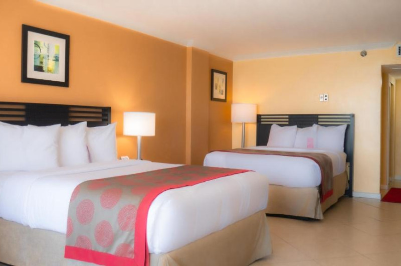 Each warmly decorated room at Ramada Plaza by Wyndham Marco Polo Beach Resort features a wall-mounted, 27-inch LCD TV. A fridge and a small table with chairs are provided. Many rooms have a private balcony.