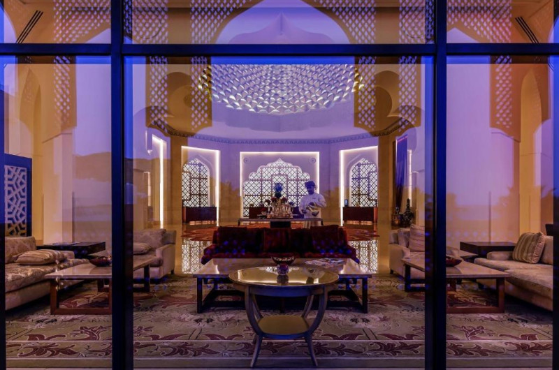 Oaspetii au acces la 19 baruri si restaurante din intregul complex. Există 7 restaurante principale, 2 restaurante deschise intreaga zi, 2 baruri la piscină, 2 lounge-uri in hol, 6 cafenele si baruri. Bait Al Bahr este un restaurant cu fructe de mare cu vedere superbă la mare de pe terasă, BAB Lounge este barul pe acoperis al hotelului, iar Capri Court este un restaurant italian contemporan. Oaspetii au acces la alte 2 restaurante, Shahrazad si Sultanah, in vecinătatea Shangri-La Al Husn Resort & Spa.