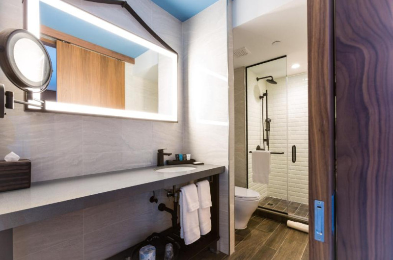 The on-site restaurant Burgerology is located adjacent to the lobby and serves American cuisine for breakfast, lunch and dinner. It also features a backyard bar with a retractable roof.