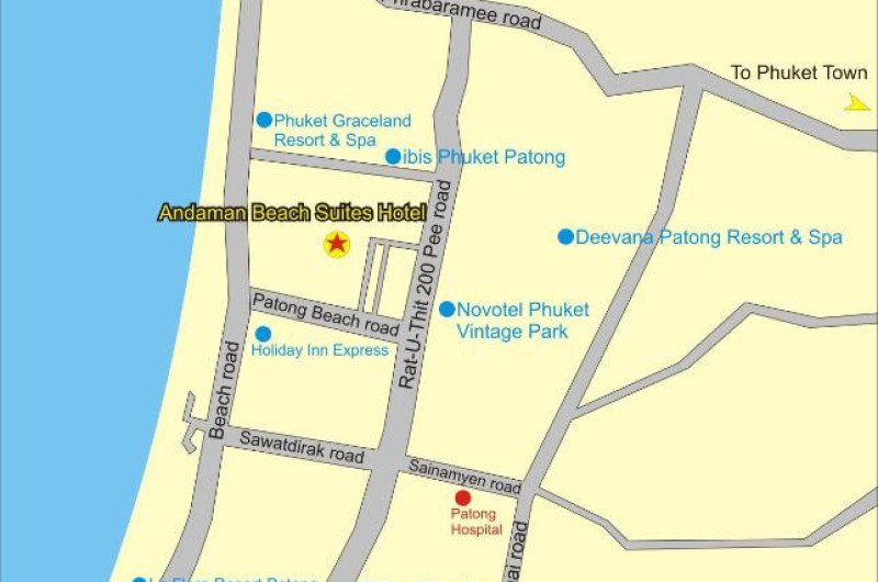 Centrul comercial Jungceylon si zona animată Bangla Road se află la 15 minute de mers pe jos de Hotelul Beach Suites. Aeroportul Internațional Phuket este situat la 45 de minute de mers cu mașina.