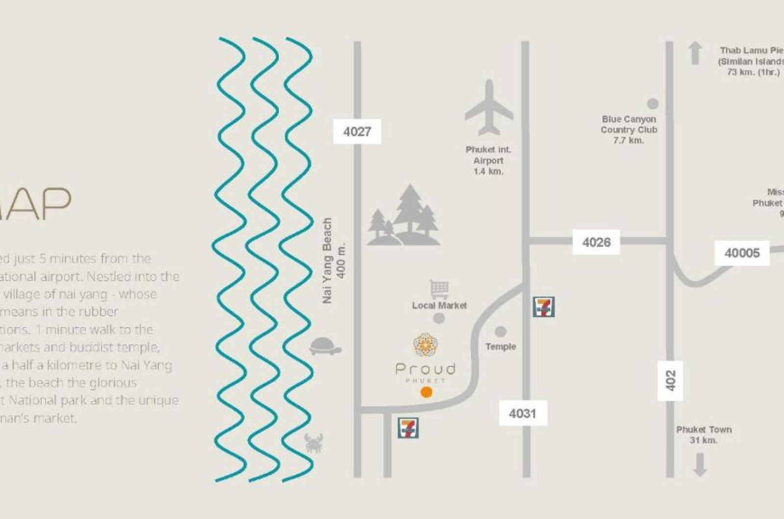 Hotelul se află la 2 km de Aeroportul Internațional Phuket și la 12 minute de mers cu mașina de Blue Canyon Country Club. Frumoasa plajă Nai Thon este la o călătorie de 6 km, iar alte atracții principale din Phuket, inclusiv Patong, se află la 1 oră de mers cu mașina de proprietate.