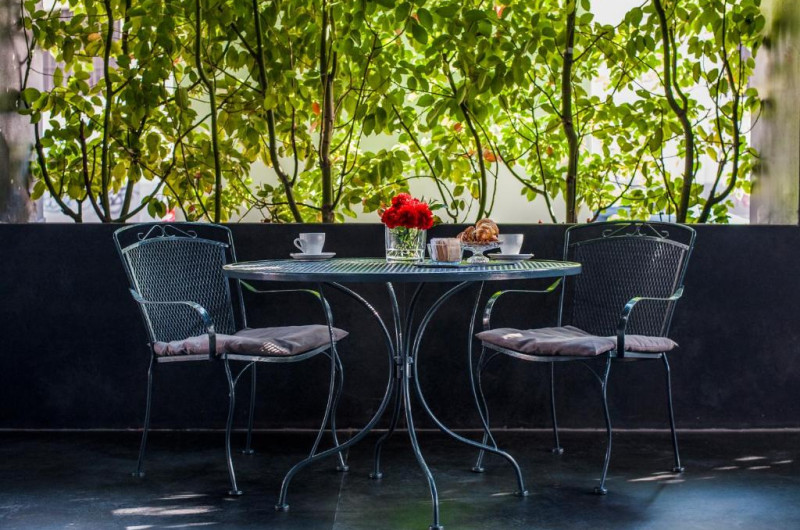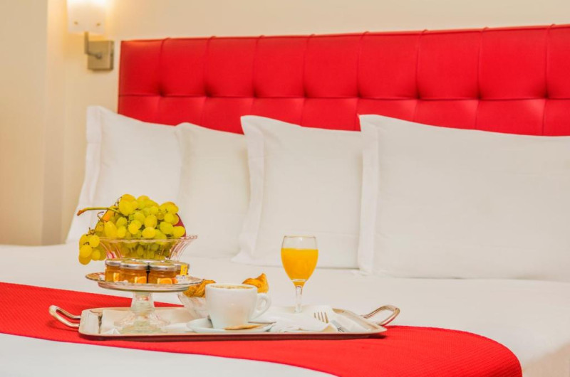 Micul dejun tip bufet cuprinde opțiuni dulci și sărate, precum mezeluri, branzeturi, cornuri și prăjituri de casă.