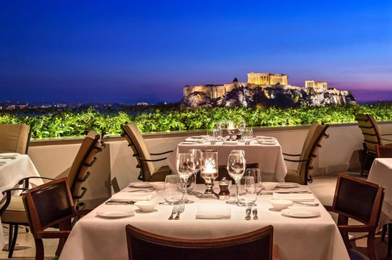 De la restaurantul Roof Garden al Hotelului Grande Bretagne poate admira Stadionul Olimpic original in timp ce inotă in zonă, Acropolele din scaunul de la bar sau Partenonul in timp ce săvarăți cele mai bune preparate din bucătăria mediteraneană.