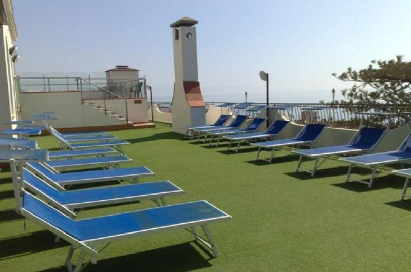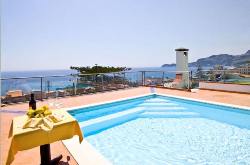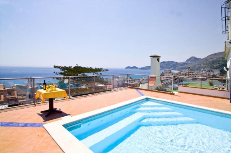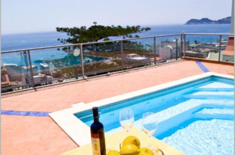 Terasa este dotată cu șezlonguri și umbrele de soare, iar piscina are un colț cu hidromasaj.