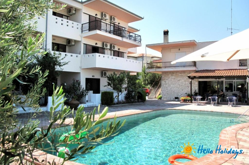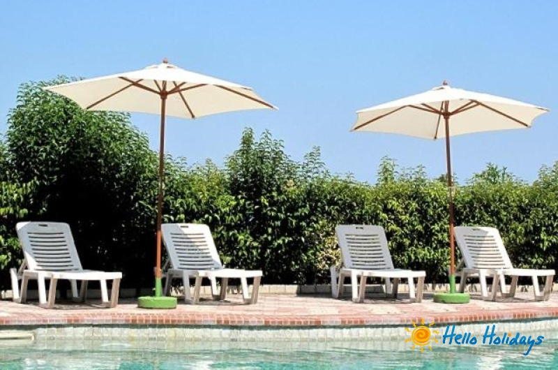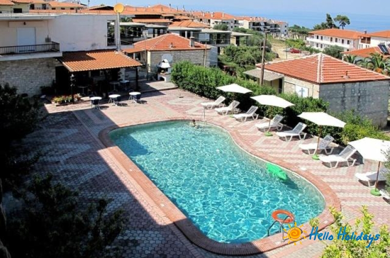 Studio Skentos pune la dispozitia turistilor curte exteriora si o piscina cocheta cu sezlonguri si umbrele pentru turisti.