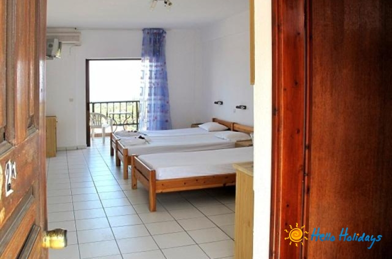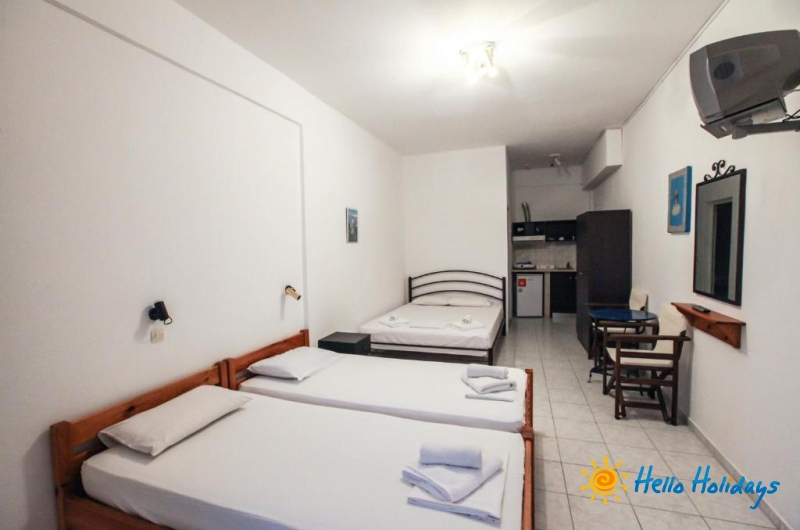 Camerele de la Skentos sunt frumos amenajate si sunt dotate cu chicineta utilata (plita, frigider, vesela), TV, grup sanitar cu dus, balcon, AC inclus. Curatenia se asigura la check-in.